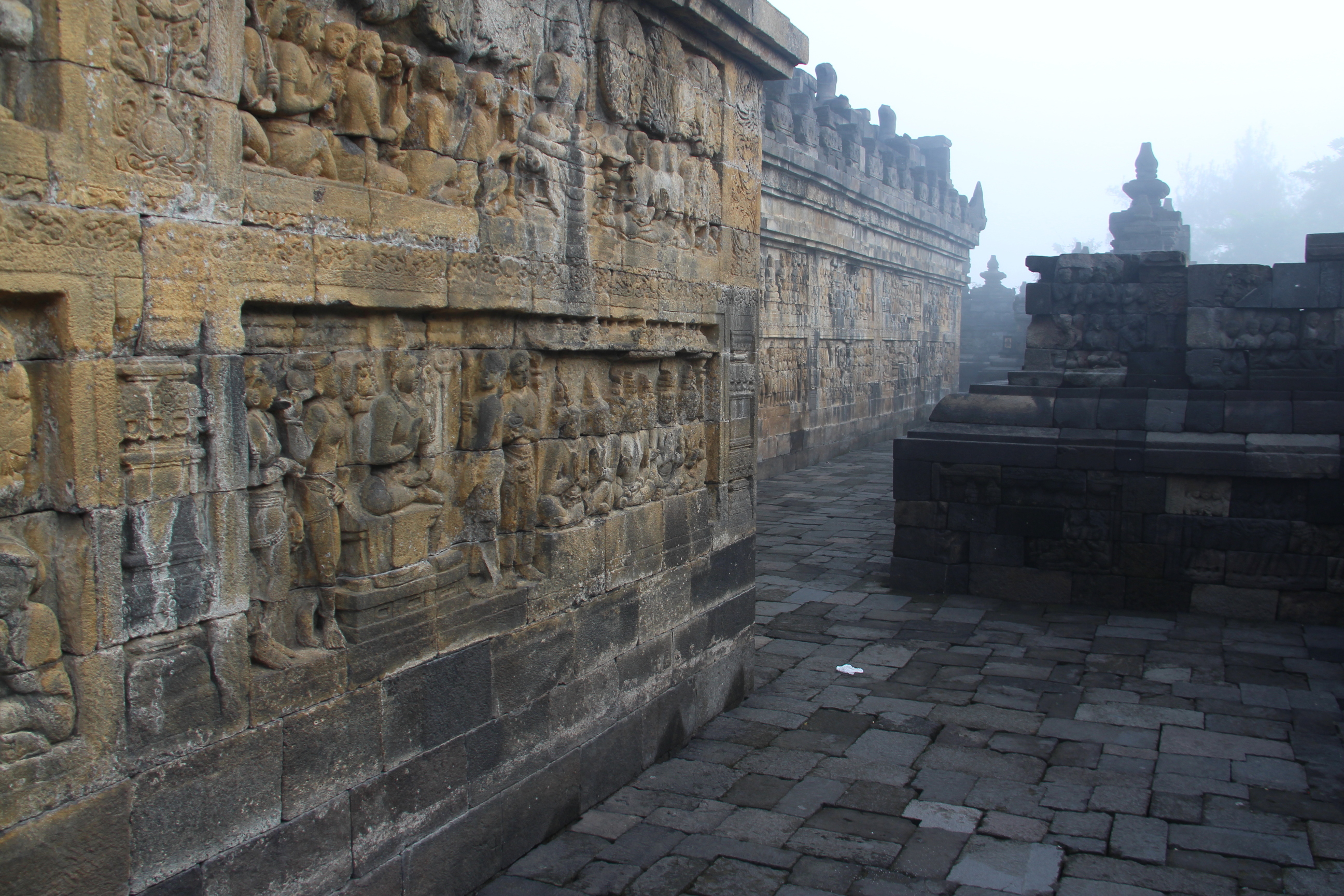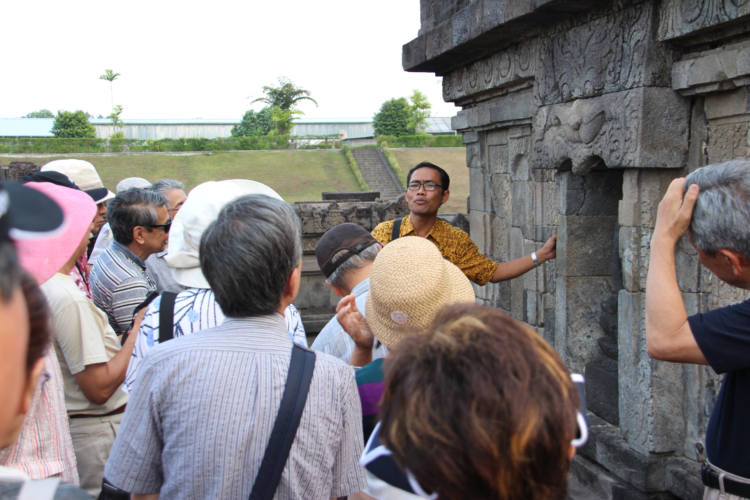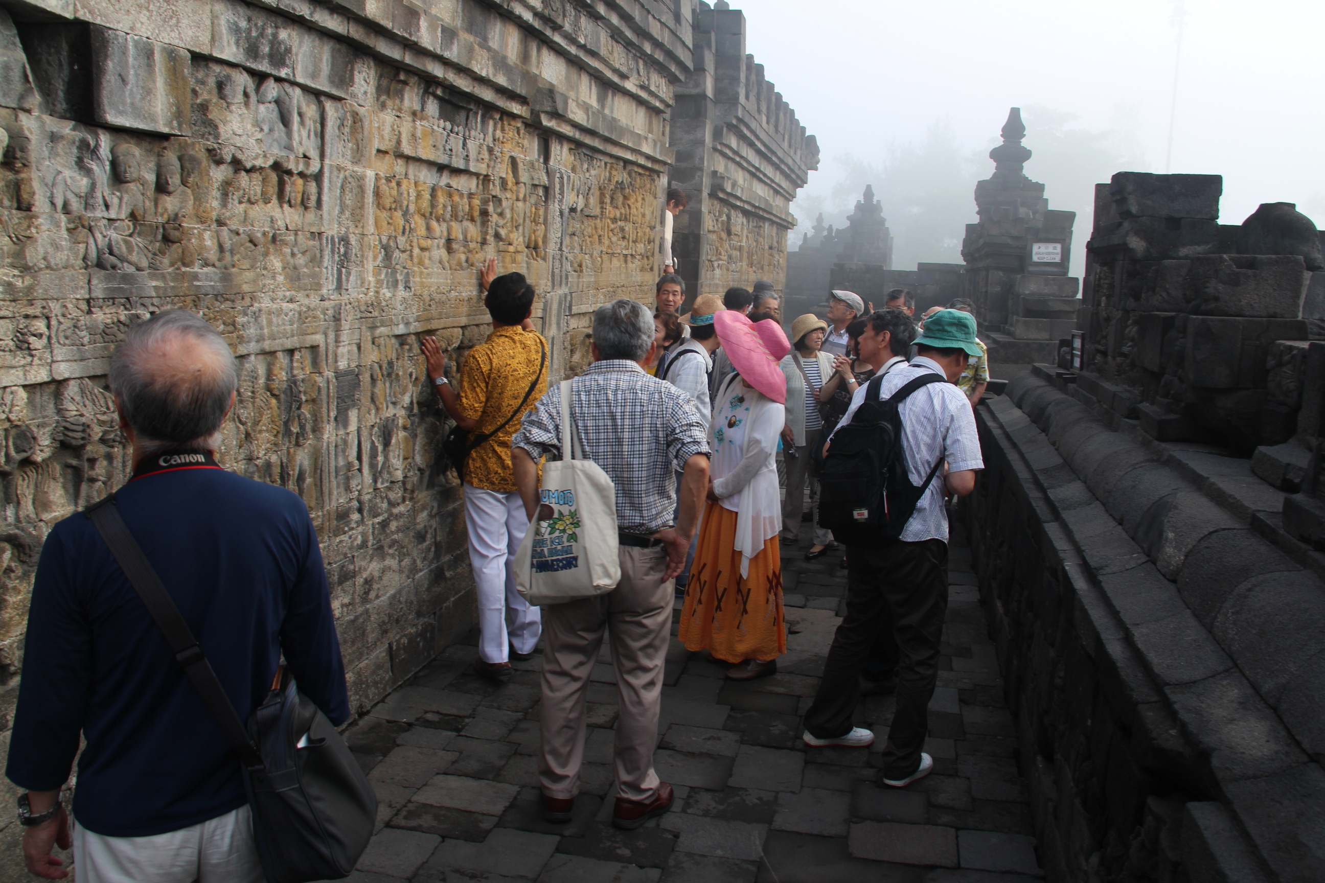 ガイドから、ダジャレを混ぜたボロブドール壁画の解説を聞く