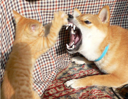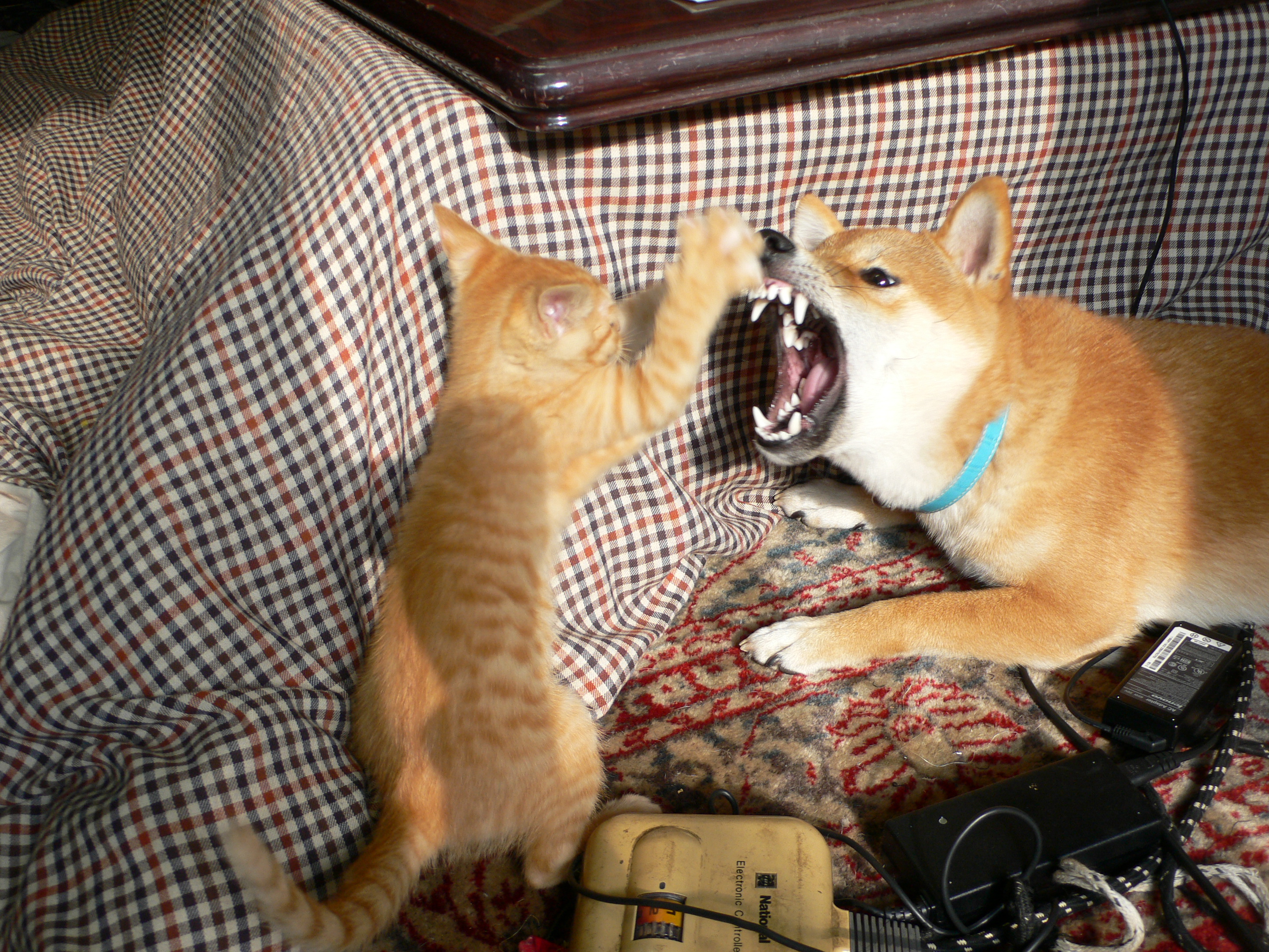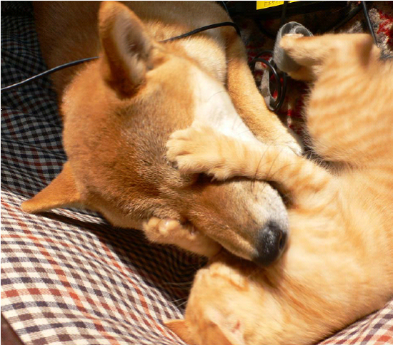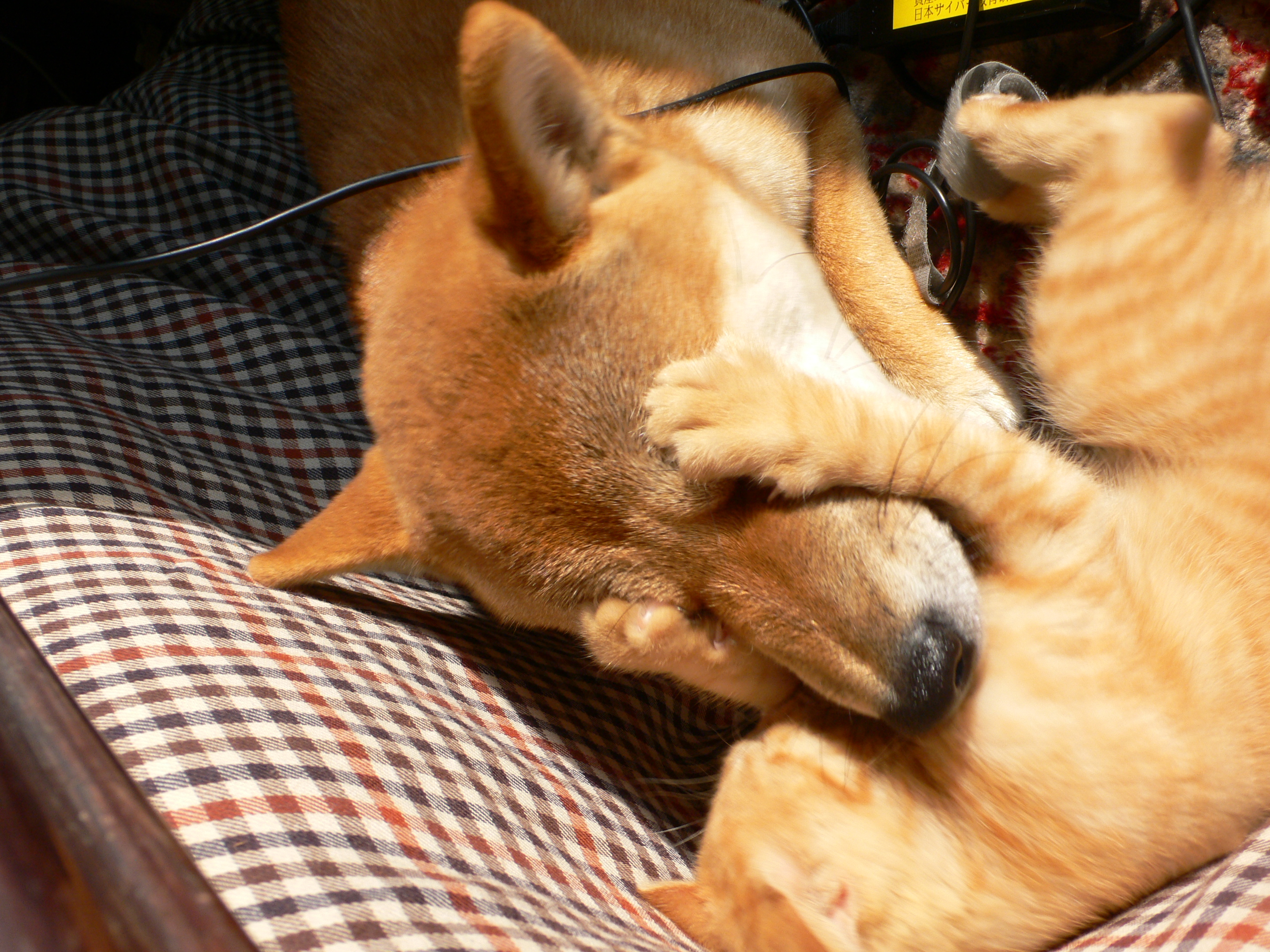 追っかけて、時には前足で押さえつけます。 そうするとお腹を見せて「許して」と言いますので、お腹やお尻 を舐める